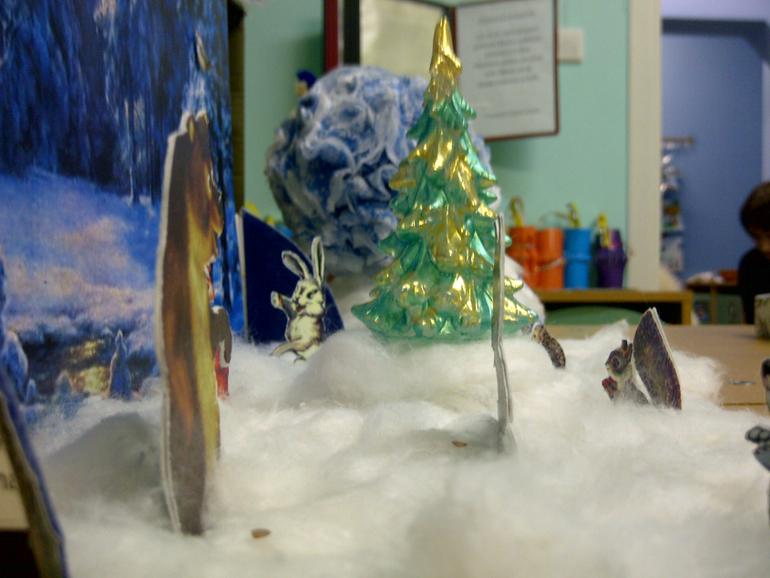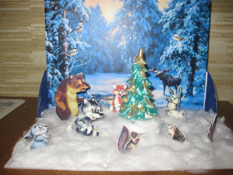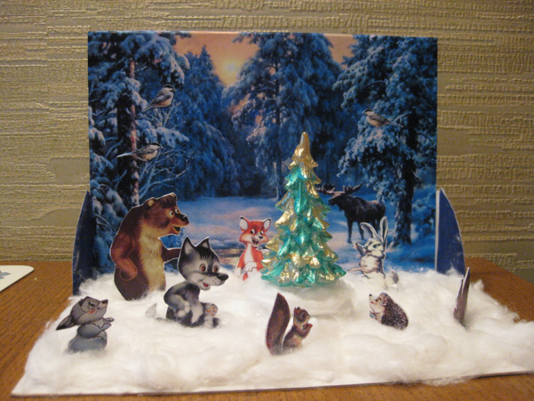 звери из картона, двуxсторонние- ёлка была прозрачная,разукрасили. Ещё потом доделала надпись 2015, надо сфотографировать в саду.