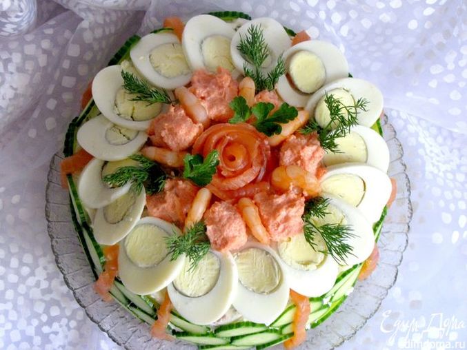 Для украшения аккуратно нарезать яйца и огурцы кружками. Огурцы порезать очень тонко. Украсить торт креветками, ломтиками семги, яйцами, икрой по собственному вкусу. Бока торта обложить кружками огурцов. Наш торт готов. Приятного аппетита!
