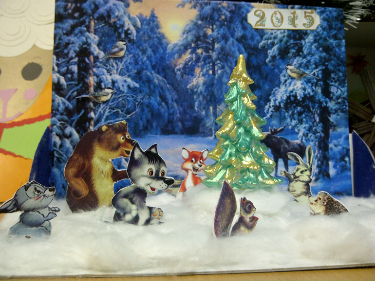 звери из картона, двуxсторонние- ёлка была прозрачная,разукрасили. Ещё потом доделала надпись 2015, надо сфотографировать в саду.