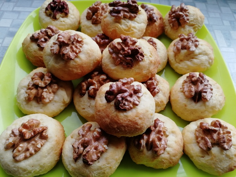Сделали с внуками творожные плюшки с половинками грецких орехов.