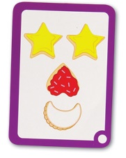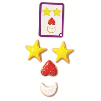В комплекте идет 20 карточек-ребусов, на которых нужно отыскать формы и выбрать печенья такой формы из общей банки. PS на другой стороне карты дается ответ