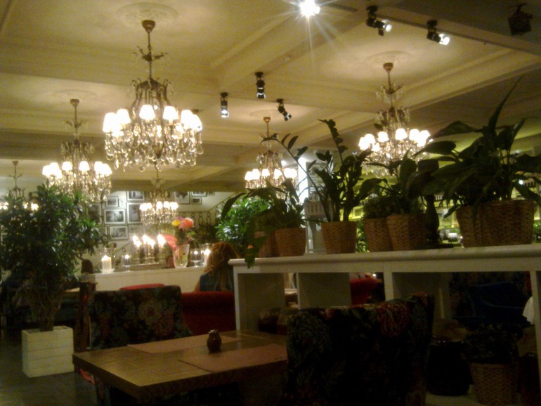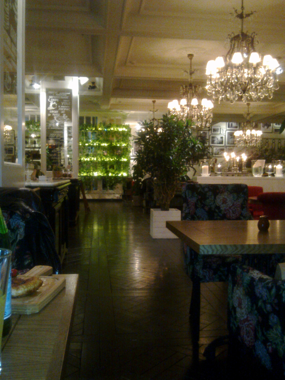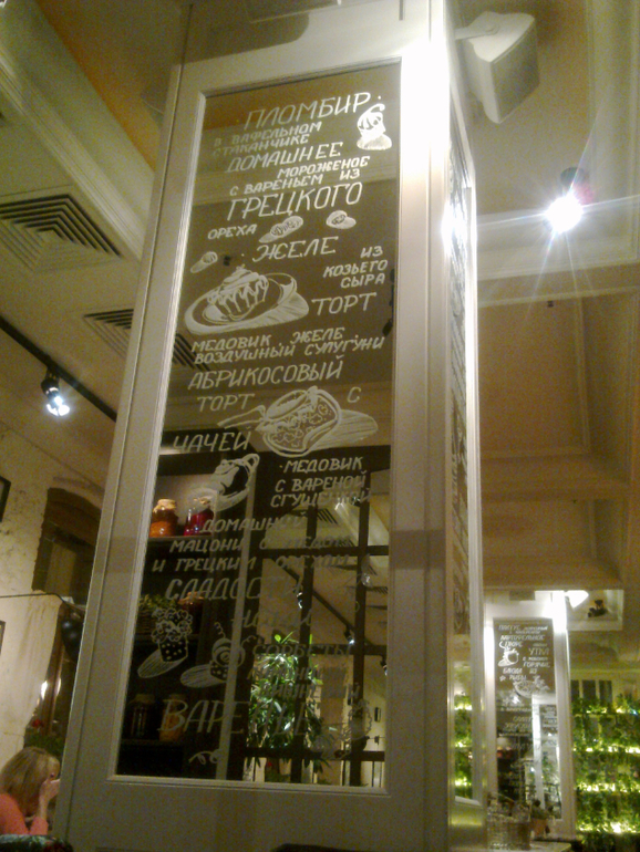 Интерьер: очень уютно, гламурные люстры легко сожительствуют с деревенскими шторками на окнах и банками с компотами. Играет фоновая спокойная музыка, столики отделены друг от друга то колоннами, то стеллажами с банками и цветами в горшках.