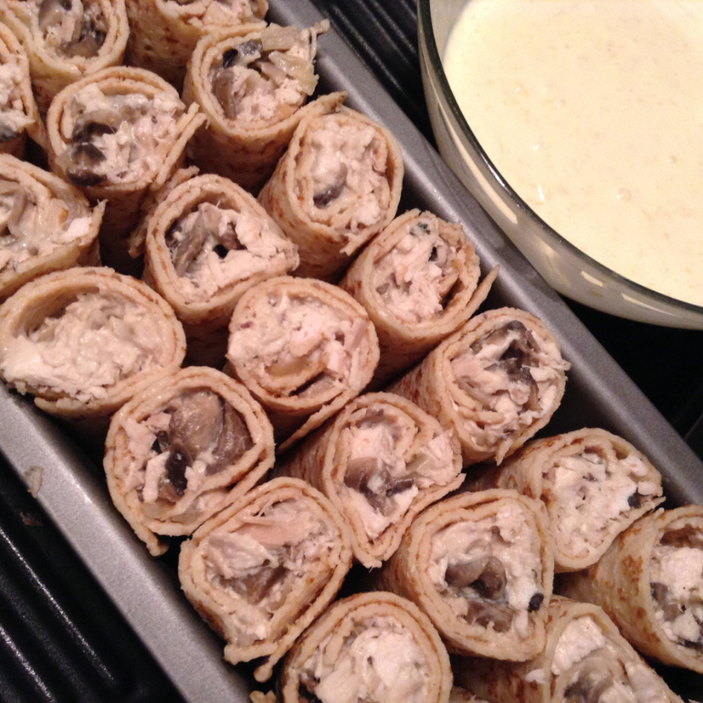 Готовите блинчики по своему проверенному рецепту, но сахарного песка кладете меньше или покупаете готовые. Отвариваете куриное филе у меня было 2 шт. и мелко режете или разделяете на мелкие кусочки. Обжариваете 200-300г нарезанных шампиньонов с 1 большой мелко нарезанной луковичкой - обжариваете 5мин, затем добавляете сметану 200г и 1 ст.л. муки еще пару минут обжариваете. Добавляете куриное мясо и смешиваете. Начинка готова. Раскладываете на блинчик, скручиваете, разрезаете блин поперек и вставляете в высокую форму. Когда все блинчики готовы, сверху заливаем соусом: 2 желтка, 100-150 г сметаны и 50-70 г сыра. Ставим в духовку на 20 мин. t=185С