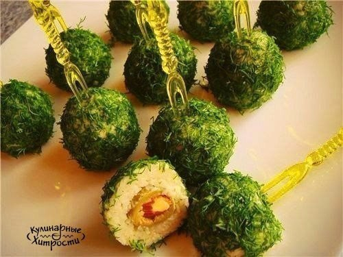 Тертый плавленый сырок смешайте с натертым на мелкой терке вареным яйцом, добавьте чеснок и майонез. Начинка: оливка зеленая с обжаренными кедровыми орешками. Сформируйте шарики, обваляйте в мелко нарезанном укропе.