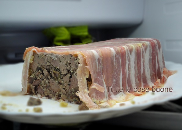 куриное мясо, мясо индейки, свиной окорок, морковь, перец сладкий (?), куриные сердечки, лук, чеснок, яйцо, фисташки, бекон, соус