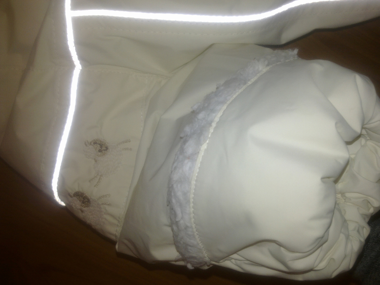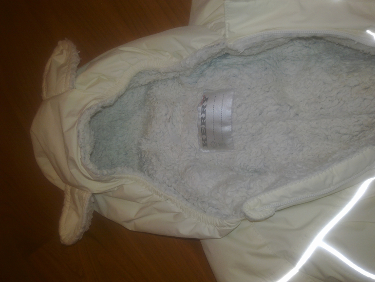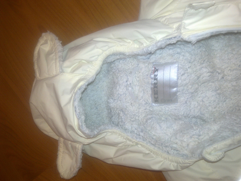 На комбезе пришит размер 68, носили его пока лежали в коляске с 65 см, и может неделю успели в нем потопать ножками, когда только начали ходить.