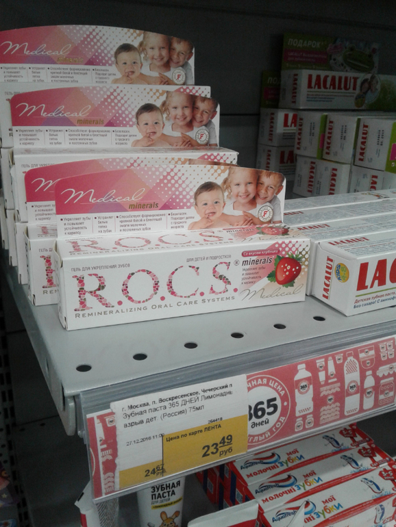 Зубная паста R.O.C.S. самая дорогая, стоит на верхней полке. Цены на нее начинаются от 100 руб. и выше. Тут явно ошибка, думаю я и беру одну, фотографирую витрину. Специально заканчиваю обследовать магазин, иду на кассу. Итак, битва началась)))