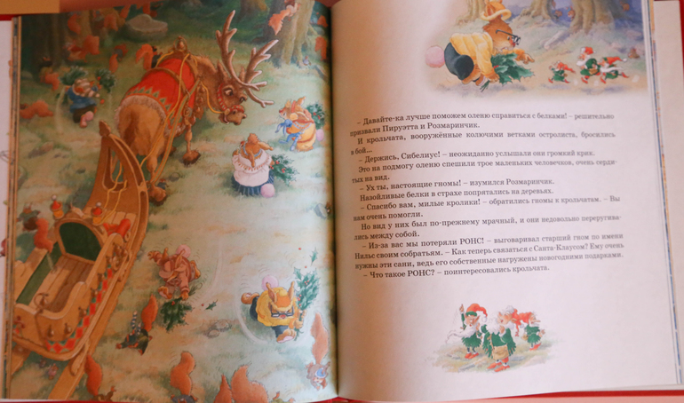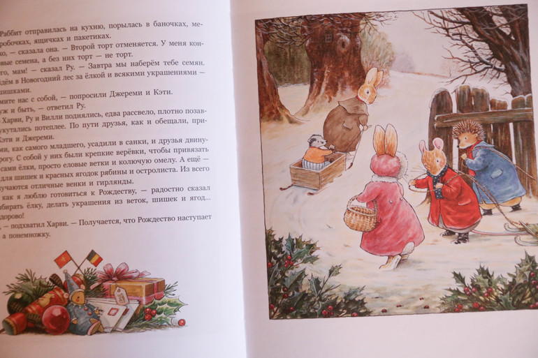Довольно толстенькая книга с тремя веселыми историями про кроликов. Иллюстрации очень милые и с кучей уютных деталей для рассматривания)) Я вот очень люблю рассматривать во всех подробностях кроличьи домики)) Не смотря на длину историй Варя их слушает до конца. Действительно истории захватывающие! Первая история, например, про то, как крольчата приехали в гости к дедушке на зимние каникулы. Некоторые из них решили кататься на коньках, некоторые на лыжах, а самые маленькие впрягли в старые санки большого пса и пошли смотреть, как катаются их братья и конечно всем мешались под ногами))