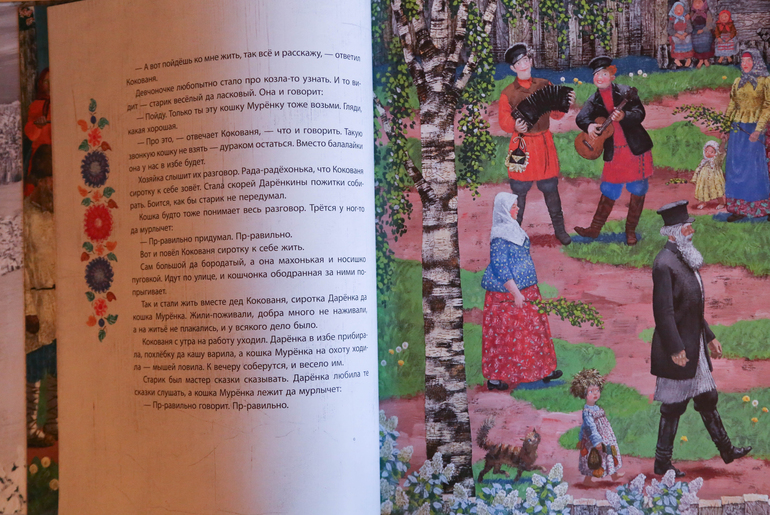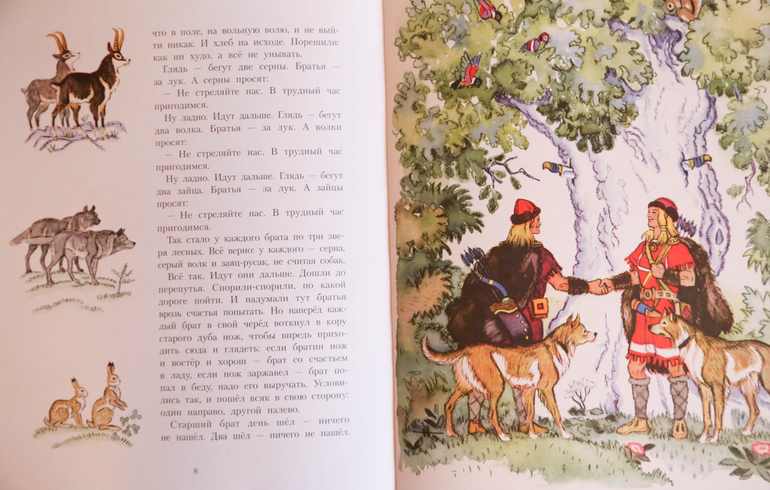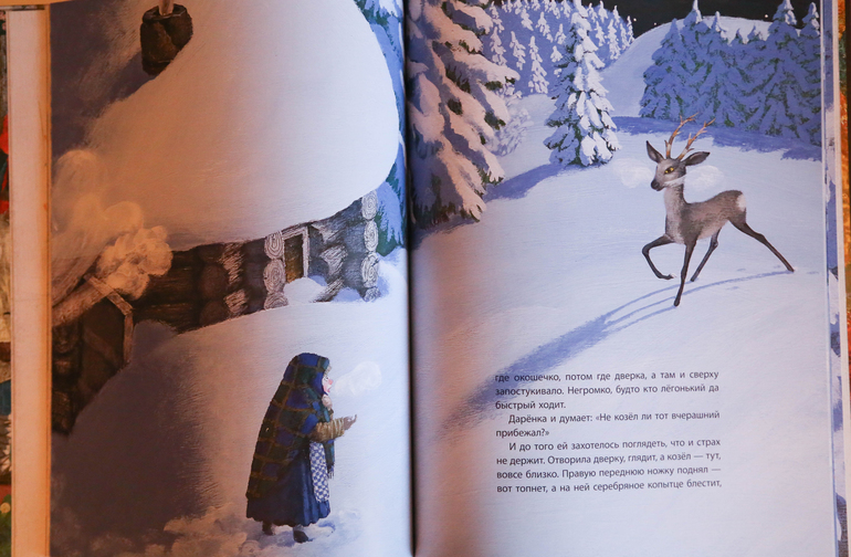 Количество текста тут вроде бы разное и не везде большое, но иллюстрации... Это тоже одна из книг, которую восхваляли в отзывах и пока что мне не понятно за что. Т.е. с точки зрения мамы и взрослого человека книга прекрасна, но она же в первую очередь должна нравиться ребенку. У художника великолепно получились пейзажи! Они волшебные! И на фото наверно не видно, но иллюстрации даже с фактурой краски, их можно долго разглядывать именно с точки зрения изучения техники рисования и можно пытаться повторить. Животные тоже очень хорошо вписываются в пейзаж. Но люди... Я ниже прикрепила картинку с изображением людей и она как назло первая в книге. Мы с Варей открыли книгу, с удовольствием рассмотрели первый форзац, но перевернув страницу и увидев таких людей Варя сразу категорически сказала "нет", и я ее понимаю. Нет, конечно есть такой стиль в живописи и я знаю, что даже портреты в таком стиле висят в Третьяковке, т.е. я вполне согласна, что это шедевр, но просто не для детской книги эти иллюстрации. Не знаю как объяснить, но вот смотришь на книгу и видишь заснеженный лес, оленей, дымки из труб на крышах домов и тут такие люди, которые в атмосферу не вписываются, да и стиль изображения мне не нравится. Но это как говорится на вкус и цвет, никого не хочу обидеть.