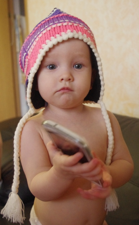 Ну и какая же она большая уже, моя крошечка, 7,8 кг, 75 см. 8 зубов, "ам" и "мамамамама", столько осмысленности во взгляде и поступках. Камикадзе, ничего не боится. Регулярно получает синяки от падений и столкновений :( Но плачет через раз, суровая женщина. Сегодня свалилась с дивана прям на кубик от конструктора, на голове остались 2 кругленьких отпечатка. Потом подносила его к голове и возмущалась на своем языке, видимо рассказывала о столкновении с кубиком)