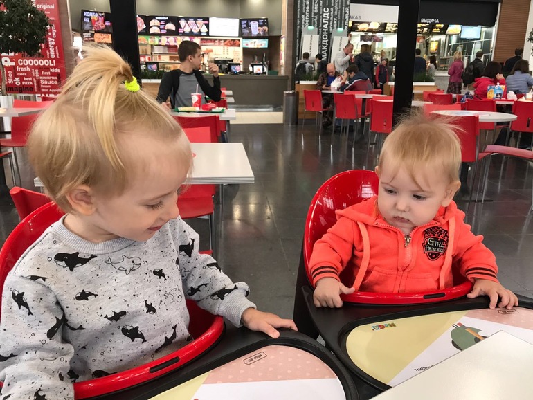 Ева миру жалеет, утешает, если та плачет. Развлекает: играет с ней, зовёт с собой в домик или в комнату, просит включить музыку и танцует, чтобы Мира смеялась. Говорит мне если у Миры грязный подгузник (вернее, делает "буэ, мама, помой мире попу, она вонаааает", но давайте без деталей))). Играет с мирой в игровых комнатах, делится с ней едой (сегодня вот еле успела предотвратить дарение чупа чупса). Катает миру на спине (пока я держу ту под мышки), позволяет таскать себя за волосы, развлекает Ее чтоб не плакала в автокресле. Я даже теперь иногда могу сесть спереди, а не втискиваться между двумя креслами. Ещё они играют в прятки и догонялки (ну как, они играют между собой, а я просто выполняю роль ног, бегая с мирой на руках куда мне укажут).