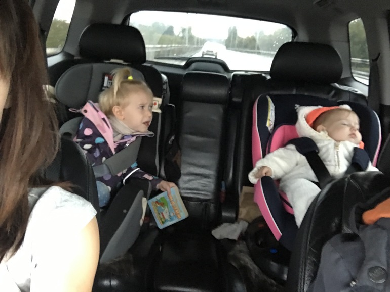 Ева пытается разбудить спящую Миру. Вообще в нас вечный бой за автокресло мирино. Кратко: мирино стоит 6 (без изофикс вообще 4), евино - 16. Но... все хотят в мирино! И я б в принципе поменяла, мне не трудно, но мире в евином неудобно, она не может долго сидеть, начинает вопить. Так что вечный бой кто поедет в розовом))