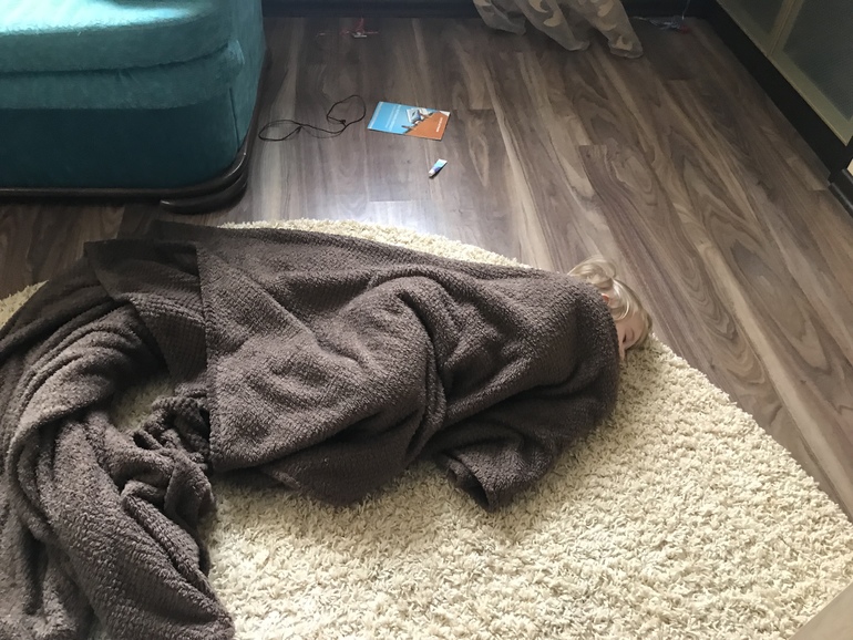 ЕваИ немного подкашливает. Сегодня в саду была фотосессия, мы ее, разумеется, пропустили( ну да ладно. Ева все утро капризничает, канючит, в итоге легла на пол, лежит. Встала, взяла плед, легла обратно и....уснула! В жизни один раз всего сама засыпала, это второй. Уже несколько месяцев дома не спит днём, а вот, дрыхнет
