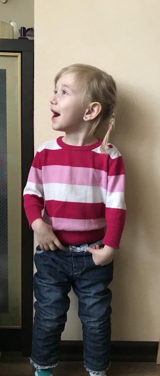 С месяц назад в игровой Ева увидела девочку с сережками и тоже захотела. Прежде предлагали проколоть - отказывалась, а тут сама попросила. Но там не оказалось салона, поэтому тема замялась. Сегодня Ева ни с того ни с сего говорит - давай проколем мне ушки? Я говорю: а давай. Записались в салон неподалёку, собрались и поехали.