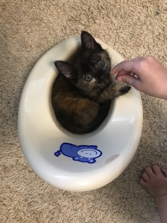 Это Ривер. 24.06 ее и ещё 6 котят родила кошка на складе в магазине :3 и вот, Рири 1,5 месяцев, и она попала к нам. Рири здорова, смела и настроена дружелюбно.