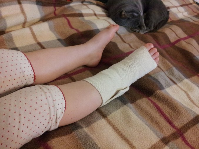 В субботу у Уль потек нос, я дала ей убойную дозу анаферона, закапала изофрой и вроде состояние улучшилось. В воскресенье поехали к друзьям. У них девочка-пятилетка. Играли они с Ульяной в соседней комнате и доигрались, прыгнула наша девочка с дивана и сильно ушибла ногу. Поехали в травму, сделали рентген, слава богу никаких переломов, только растяжение и ушиб. Но все равно от этого не легче, Улька не может наступить на ножку, ее раздражает эластичный бинт, просит его постоянно снять. Я сегодня снова сидела с ней. С одной стороны мне спокойнее, а с другой стороны пришлось снова брать день отпуска, т.к.няня не оклемалась.