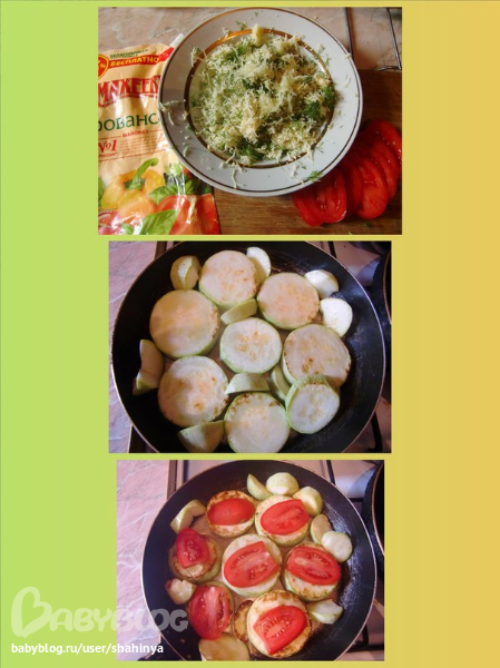 на чуть поджаренные дольки кабачка выкладываем попезанные кольцами помидоры,а также аккуратно натёртую и перемешанную начинку и закрываем крышкой.