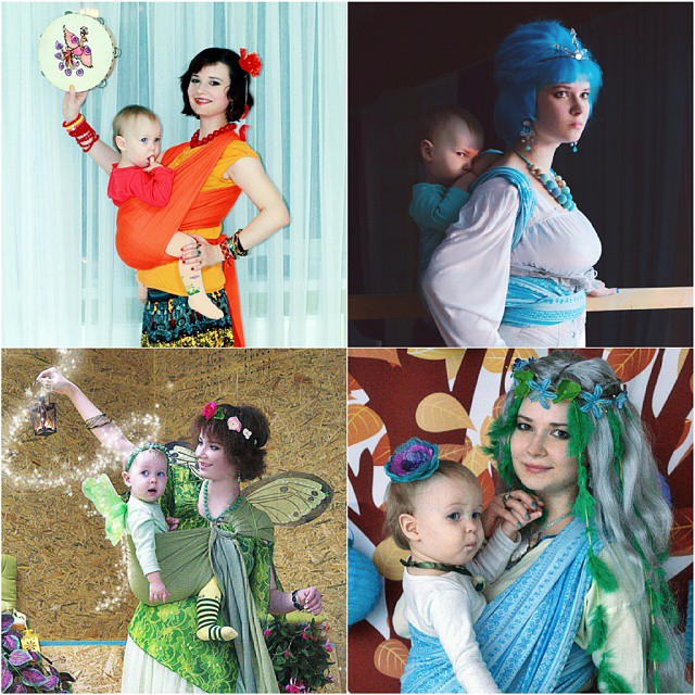 Однако, сейчас мои интересы неизменно вертятся вокруг дочери, и самореализовываться приходится порой тоже за её счёт - например, участвовать в разных конкурсах слингомам с переодеваниями)) результаты на фото. Вообще тема слингоношения меня после родов настолько зацепила, что я проштудировала массу информации об этом, и два года спустя у меня даже появилась возможность обучиться на слингоконсультанта. Не знаю, насколько мне это удалось, но клиенты пока довольны (может, это только потому, что я их пока бесплатно консультирую... а может, я и впрямь, наконец-то, помогаю людям)).