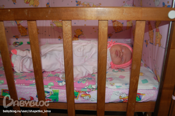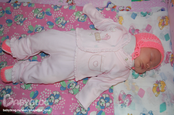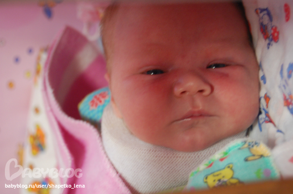 Немножко о малышке. Лерок давольно спокойная девочка, жару дает нам только последние несколько дней перед ночным сном, а в остальное время кушаем, спим и немного гуляем. Первые три недели бодрствовала час-полтора в сутки, а теперь уже побольше, часа три, наверное, и если все заняты и никто не обращает на нее внимание подает недовольный голосок. Начала улыбаться раскосой улыбкой))), правда еще не часто. Любит купаться, прям расслабляется вся, отркрывает ротик и лежит кайфует))) Очень хорошо держит голову лежа на животе и даже на руках высоко поднимается.