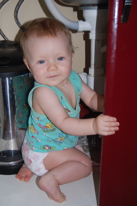 ЕЩе можем залесть в шкаф под мойкой. Мама отвлеклась на 5 минут