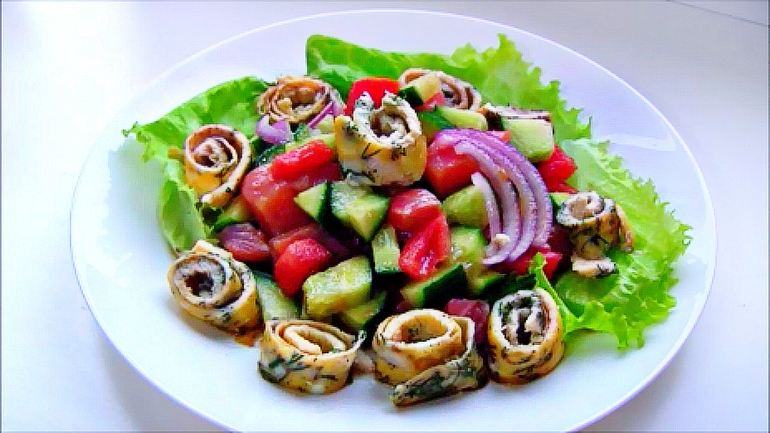 Вкусный рыбный салат , без майонеза , готовится быстро.