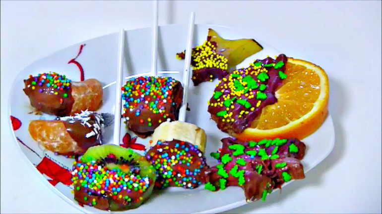 Простой ,(я бы даже сказала простейший) вкусный десерт . Фрукты могут быть любые , на ваш вкус .У меня бананы , киви , мандарины и карамбола .
