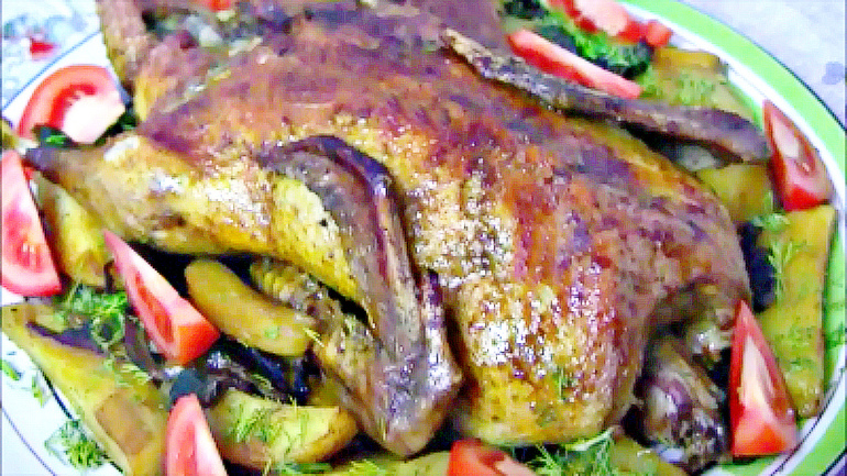 Нежная , сочная , золотистая утка с яблоками , картофелем и грибами запеченная в духовке ... ммм ...