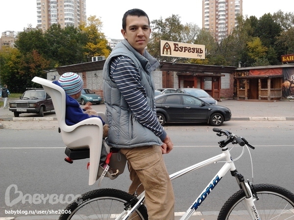 После того, как у нас два года назад сперли наши велики, решили мы снова приобщиться к велокультуре. Привезли нам два железных коня + сиденье для Ксюши. Моя довольна, Саша безмерно счастлив, ну а про Ксюню даже и говорить не нужно - всякий раз на даче замечая, что кто-то собрался ехать, просилась взять с собой, и если ей отказывали - сильно расстраивалась. Вот и сейчас долго уговаривать было не нужно. А после поездки вытаскивали из сиденья с протестом.