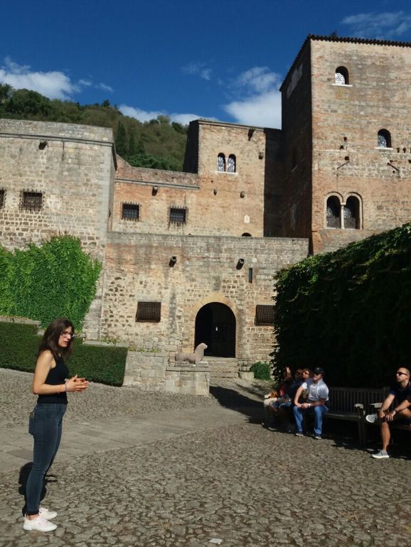 Как обычно, наш путь лежал от Кастелло в центре города, вверх по холму. Проходя мимо ворот замка, которые обычно закрыты на обед/праздник/выходные/и еще миллион причин не работать, к нам неожиданно навстречу вышла симпатичная девушка и пригласила на экскурсию. Оказывается, мы случайно пришли буквально за три минуты до начала. Надо сказать, что посещение залов музея возможно только с гидом. В замке Монселиче их проводят всего три в день в 15.00, 16.00 и 17.00, и раньше мы ну никак на них не попадали. Стоимость полного билета 8 евро, ребенок 4 евро.