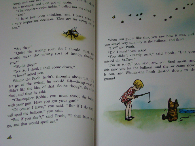 Нам по-наследству достались игрушки. И все у меня руки не доходили перебрать коробки и отобрать, что по возрасту подходит. Добралась. Да, какой клад отрыла: полное собрание Винни-Пуха, с оригинальными иллюстрациями, да еще и цветными! Я уже давно хотела Винни-Пуха в нашу детскую библиотеку. В детстве мне его не читали, но чутье подсказывало, что книга стоящая. Боже мой, какая прелесть!!!! Я в восторге от языка и изложения. Так интересно сравнивать с советским мультфильмом))). Истории достаточно объемные, но лексика доступная - Саша жует за обе щеки, а я давно не была в таком восторге от книги!))) (для сказок на английском - очень рекомендую!)
