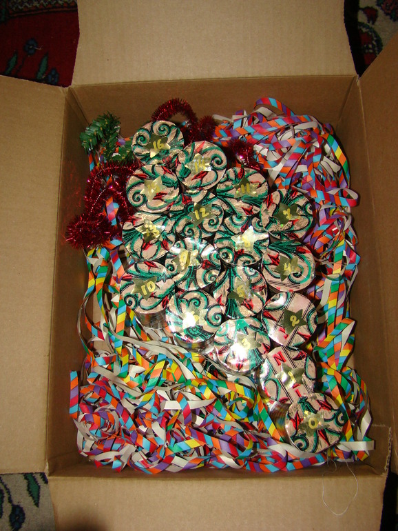 праздникиВремя поджимало. Конспирация значительно тормозила процесс. Все утро Дед Мороз пыхтел над "последними штрихами". Каледарь был бережно упакован в настоящую коробку со всеми атрибутами и даже правильным адресом. Саша вернулся из школы, мы пообедали и начали собираться в библиотеку за рождественнскими книжками. Когда все уже сидели в машине, Дед Мороз прошмыгнул обратно в дом и незаметно подбросил коробку на крыльцо, где обычно почтальон оставляет посылки. Наконец-то можно было выдохнуть!