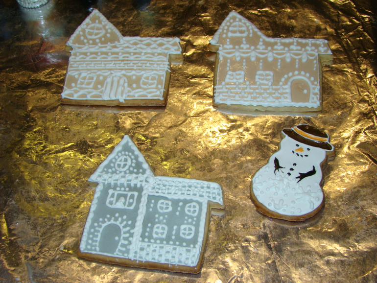 да, надо про глазурь пост написать!Секрет вот в чем: пастеризованные белки взбиваем с сахарной пудрой, постепенно добавляя ее в кол-ве, пока глазурь не станет настолько густой, что не сползает с ложки. Этот вид называется "цементный", ее используют для краев и узоров или при сборке пряничного домика. Дальше накрываешь посудину с глазурью пленкой, чтобы не обветривалась. Набираешь по столовой ложке в другую посуду и по капельке добавляешь кипяченную воду, тщательно размешивая, до нужной конт-ции. Тогда же и красители добавляешь. Для зеркальной поверхности глазурь должна растекаться (она достаточно быстро сохнет). Для украшения я делала конус из пер.бумаги для выпечки. Его лучше всего использовать для украшения печенья, но бумага должна быть плотной, иначе она размокнет минут через 10ть. Мне еще в инете встречалось, что глазурь разводят сиропом — я этого делать не рекомендую, потому что тогда глазурь застывает дольше или не застывает полностью.
