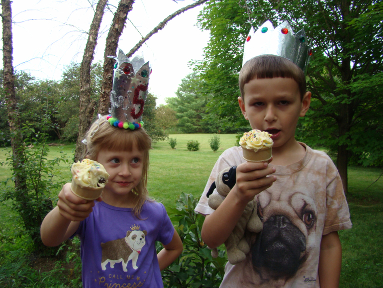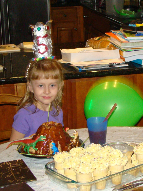 Вылез 19тый зуб. Рост 117см, вес 19 кг. Сбылась ее маленькая мечта: мы нашли ей сиреневую футболку с бульдогом))). Мы испекли торт Муравейник в виде вулкана и украсили его динозаврами. Мы сделали пирожные брауни в вафельных стаканчиках с кремом в виде мороженого. Мы добрый час пыхтели над короной на пятилетие, которая светится в темноте, а потом охотились на зайцев во дворе. А когда стемнело, мы нашли в темном углу пять чудесных светящихся шаров, которые не гаснут уже вторые сутки. Через месяц в школу, в подготовительный класс. Мы его очень ждем, нам очень скучно без друзей дома.