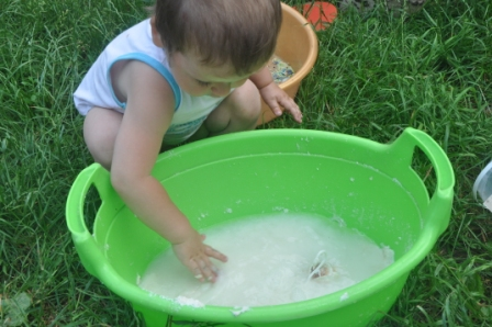 А потом Костя решил что в одном тазике не интересно играть и начал переливать из одного в другой, потом назад, потом туда же добавил содержимое другой сенсорной коробочки с песком и камушками, которая случайно оказалась рядом - в общем получились настоящие грязные игры!