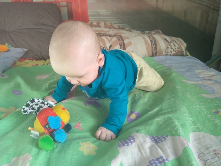 Всем привет пишу запись для себя на память).Вчера нам исполнилось 5 месяцев и о чудо сегодня мы поползли, не по пластунски как ползали до этого, а как взрослые) на четвереньках. Итак что Макс умеет к 5 ти месяцам: хватать игрушки, играть с ними, трясти, бросать. Сидеть в стульчике и кушать прикорм. Ползать на четвереньках. Переворачивается со спины на живот. Узнает себя в зеркале, знает своё имя и оборачивается на голос. Гулит, говорит мам) бу-бу-бу, папа еще не говорит но пытается. Капризничает, когда что-то не по его, плачет при виде незнакомых людей и наоборот громко смеётся при виде папы и мамы). Когда ставлю на ножки, встает уверенно полной стопой и перемещает ножки как при ходьбе. Теперь ждём когда сядет сам). Думаю ждать недолго осталось.