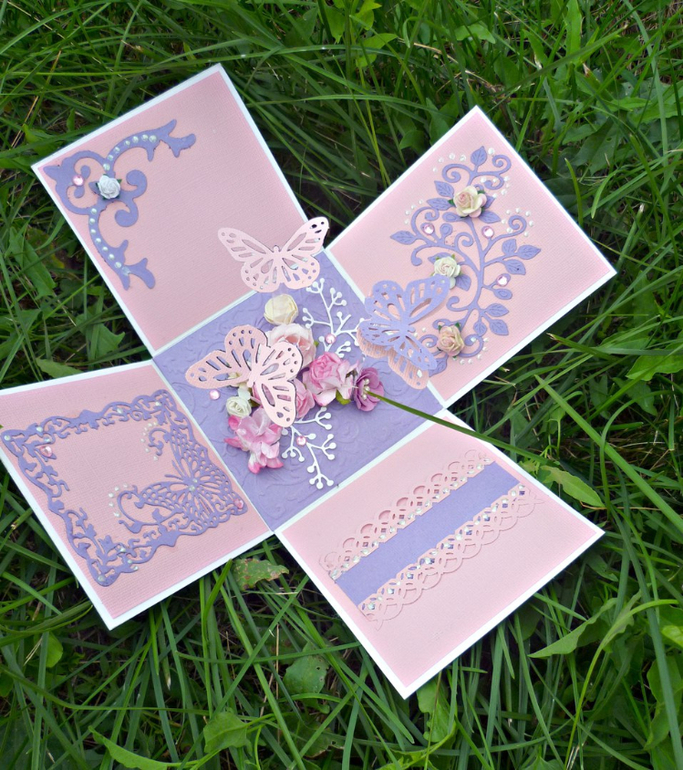 Просили коробку-сюрприз в розово-сиреневой гаме и с местом для денежного подарка и местом для надписи.
