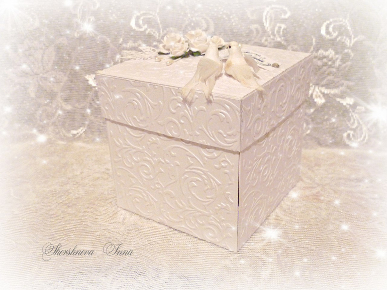 Белоснежная коробка из перламутрового кардстока с тиснением и парой голубков на крышке.