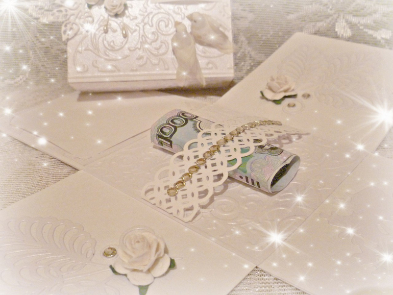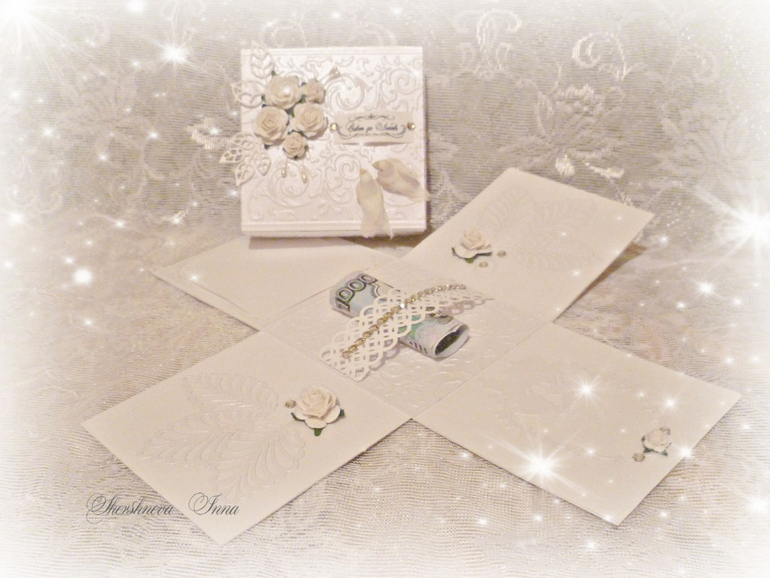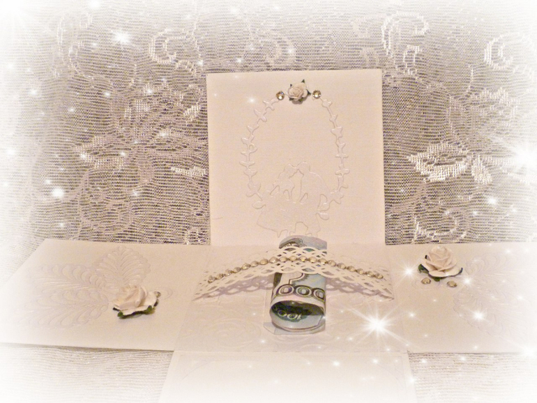 Внутри распахивающихся створок место для поздравления, вырубка из перламутрового кардстока( пара влюбленных на качелях, ажурные листики) и место для подарка- денежных купюр.