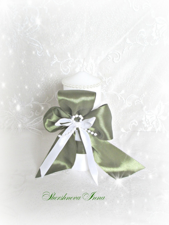 Бутылки шампанского покрыты матовой белой краской. На ленте полоска оливковой ленточки и полужемчужины.
