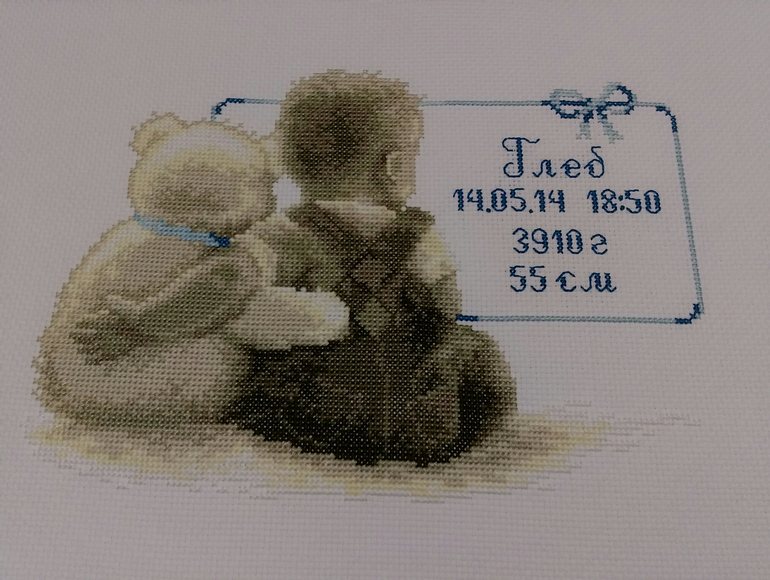Вышила метрику сыну друга нашей семьи. Метрика от Вервако "Малыш и мишка". Схему мне любезно предоставила Ольга, за что ей огромное спасибо! В тот же вечер мое нетерпение погнало меня в магазин за нитками, я закупилась и приступила к вышиванию. Большая половина вышилась благодаря Вышивальному забегу, наверное, никогда так много я не вышивала, как в первый день ВЗ!