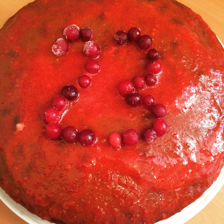 Коржи смазала клубникой с сахаром и банановым пюре! Сверху ягодки клюквы! Приятного! ;)