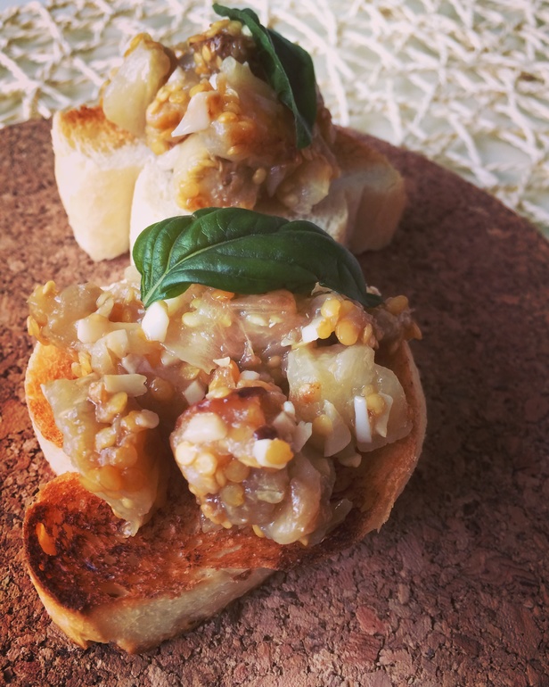 Баклажаны помыть, почистить, порезать кубиками, посолить, и оставить постоять с небольшим количеством холодной воды. Хорошо отжать от влаги, поджарить на растительном масле с мелко нарезанным чесноком. Добавить пару чайных ложек лимонного сока. Выложить в стеклянную посуду и дать остыть. Батон подсушить, слегка взбрызнуть оливковым маслом и сверху положить баклажаны и листики базилика. Закуска готова ;)
