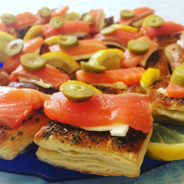 Слоеное тесто дрожжевое раскатываю и режу на квадраты, половину выкладываю на противень на пекарскую бумагу и смазываю яйцом. Из остальной половины квадратиков вырезаю серединки и выкладываю (те что с дырочкой) сверху. Сверху тоже смазываю яйцом, посыпаю смесью итальянских трав и выпекаю минут 10-15 при 200. Даю остыть. В ямки)) кладу кусочек сливочного масла, красную рыбу и оливку. Дольки лимона прокладываю между бутербродами. ( не класть лимон на рыбу, иначе она побелеет!) Закуска к водочке готова 😜