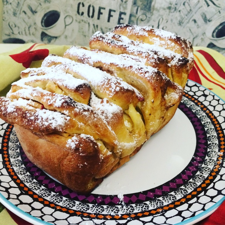 Масло сливочное - 60 г Молоко - 140 мл Яйцо - 2 шт Ванилин - пол пакетика Сахар - 40 г Мука - 420 г Соль - 0.5 ч.л. Дрожжи - 2.25 ч.л. (быстродействующие) Масло сливочное - 2 ст.л. (для начинки) Сахар коричневый - 100 г Корица - 1 ч.л. Яблоко - 1 большое