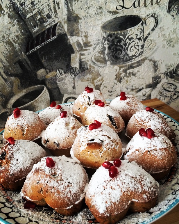 240 гр муки смешать с разрыхлителем (1 ст ложка), ванилином (5 гр) и щепоткой соли. Масло сливочное (100 гр) смешать с сахаром (100 гр) и растопить на водяной бане. Масляную смесь взбить венчиком и ввести по одному яйца (4 шт). Перемешать полученную смесь с мукой и двумя столовыми ложками крепкого сваренного кофе. Порубить горький шоколад (грамм 60) и перемешать с тестом. Формочки смазать растительным маслом, наполнить на 3/4 тестом и выпекать минут 20-25 при 200. Остудить и украсить сахарной пудрой и зёрнами граната.