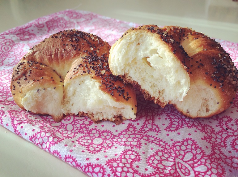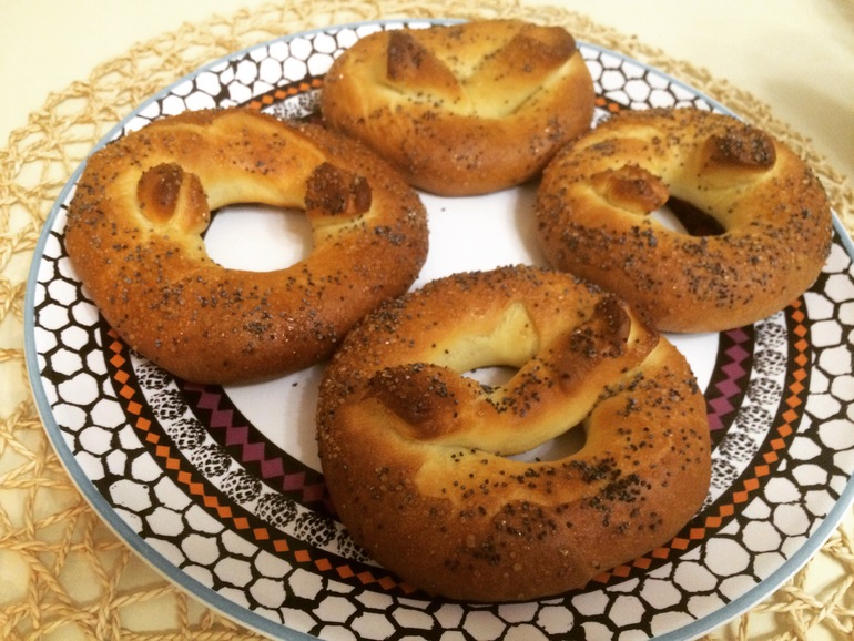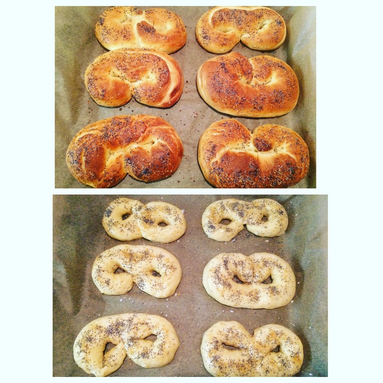 ням-ням омномном вкусняк ...600 гр муки просеиваем и смешиваем с чайной ложкой соли и растираем с мягким сливочным маслом (100 грамм). Три яйца взбиваем со 100 гр сахара и добавляем к муке. Две чайных ложки сухих дрожжей разводим в 120 мл воды, добавляем к общей смеси и замешиваем тесто. Оставляем в тёплом месте минут на 40 на подъём. Разделываем тесто на булочки и бублики. Выкладываем на пекарскую бумагу, смазываем молоком, посыпаем коричневым сахаром и маком и выпекаем минут 20-25 при 180.