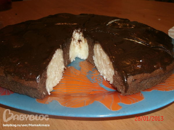 Шоколадный пирог с творожными шарикамиИнгредиенты:Для шариков-творог — 250 г-желтки — 2 шт.-сахар — 50 г-кокосовая стружка — 50 г-крахмал — 3 ст.л. (без верха)Для теста-яйца — 4 шт.-сахар — 30 г (+30 г)-шоколад — 50 г-мука — 2 ст.л.-крахмал — 2 ст.л.-какао — 3 ст.л.-соль — щепотка-ванильный сахар — 2 пакетика-разрыхлитель — на кончике ножаСпособ приготовления шоколадного пирога с творожными шарикамиСначала приготовить шарики. Для этого творог смешать с сахаром, крахмалом, кокосом и желтками. Хорошо перемешать, до получения однородной массы. Сформировать шарики.Тесто. Отделить белки от желтков. Взбить желтки с сахаром и ванилином до светлой гладкой массы. Добавить растопленный шоколад. Просеянную муку, крахмал, разрыхлитель, какао и соль ввести в яично-шоколадную массу и размешать.Взбить белки с 30 г сахара до устойчивых пиков. Аккуратно ввести в массу и лопаткой движениями сверху вниз соединить вместе.Форму для выпечки застелить пергаментной бумагой, выложить шарики.Сверху залить шоколадной массой.Выпекать при температуре 180 градусов 30-40 минут.Сверху полить шоколадной глазурью.На днях пекла нереально вкусно! Попробуйте