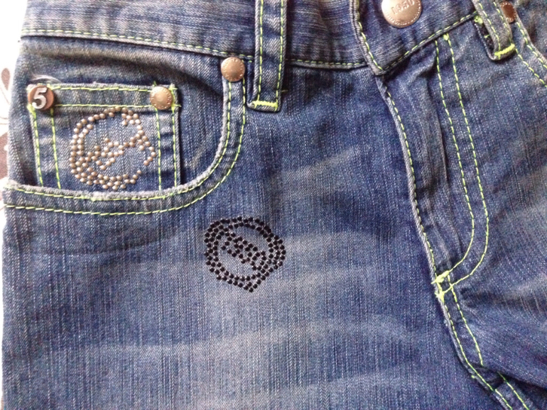Джинсы I Pinko Pallino, новые, только бирки срезали. Покупала поздней осенью, думала на весну-лето в садик, но увы кнопка на нашей талии не сошлась:(( Очень оригинальные джинсики с яркой прострочкой и аппликацией, стиль свободный, бананчиками, стеснять движение не будут, на кнопке. Есть утяжка на талии.