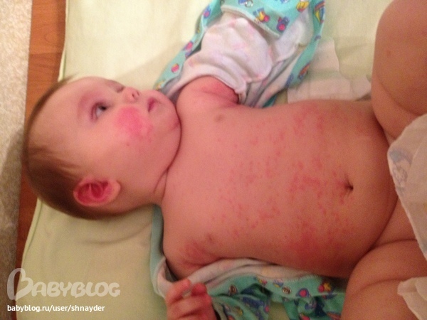 У первой дочки была аллергия на белок коровьего молока с рождения. Приобрела она ее у меня в животике, потому что Я очень люблю молоко и пила его в период беременности ОЧЕНЬ много, в итоге у ребенка выработался аллерген. Мне пришлось самой отказаться от молочки до 2-х лет (пока кормила грудью), нам был поставлен диагноз АТОПИЧЕСКИЙ ДЕРМАТИТ, лечили фенистилом (капли) и на кожу гормональный крем ЭЛОКОМ. только к 3-м годам эта бяка нас покинула, постепенно вводила молочко, реакции были, но не сильные, пока совсем не пропали. Но до сих пор у ребенка "гусиная кожа" вся в пупырышки и сухая. Я думаю это последствия. У вас по фото я думаю тоже атопический дерматит. Аллерголог должен назначить грамотное лечение, ну и конечно диета.