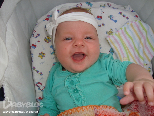 что умеем ворочиемся во все возможные сторонылюбим визжать пищать и рычать горлом) говорит много на совем тарабарском и любимое слово послеулыбки агу) пытается сесть цепляется за коляску и садиться но не надолго без опоры сек 15 сидит потом на бочек и снова пытается! ползти мы пытаемся ногами ползем авот руки подгинаются и клюем носом что очень злит ее и она переворачивается! любит прыгать на ножках но это условно просто она сгибает ножки в коленках и выпрямляет и вижит от радости)) плаваем с кругом ныряем под воду!любим стульчик для кормления! кушаем зраза молочко один раз кашу (гречневая овсянная рисовая и с фрукивми разными)пюре (мама сама делает) кабачек тыква морковь яблоко персик груша дала чуть банана сперсиком )сливу на даче пробовала малину клубнику ежевику(чтодоставляет безумное удовольствие!!! рот открывает пищит))ну вообщемвсе такие наши успехи )рост вес пока незнаем тока перебрались с дачи в москву))